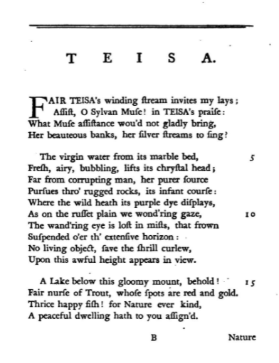 From Michael Drayton’s Polyolbion (1612), through Pope’s Windsor Forest (1704) and Wordsworth’s sonnet sequence The River Duddon (1820), to Alice Oswald’s Dart (2002), the British have been writing about rivers for hundreds of years. I’m aware of poets writing long poems right now about the Medway and the Clyde. Anne Wilson’s poem ‘Teisa – A Descriptive Poem of the River Teese: Its Towns and Antiquities’, fits into that sequence after Pope but before Wordsworth, in 1778, and has something of Pope’s style about it. It’s all rhyming couplets and muses, and appeals to Teisa herself, the genius loci of a feminine river.