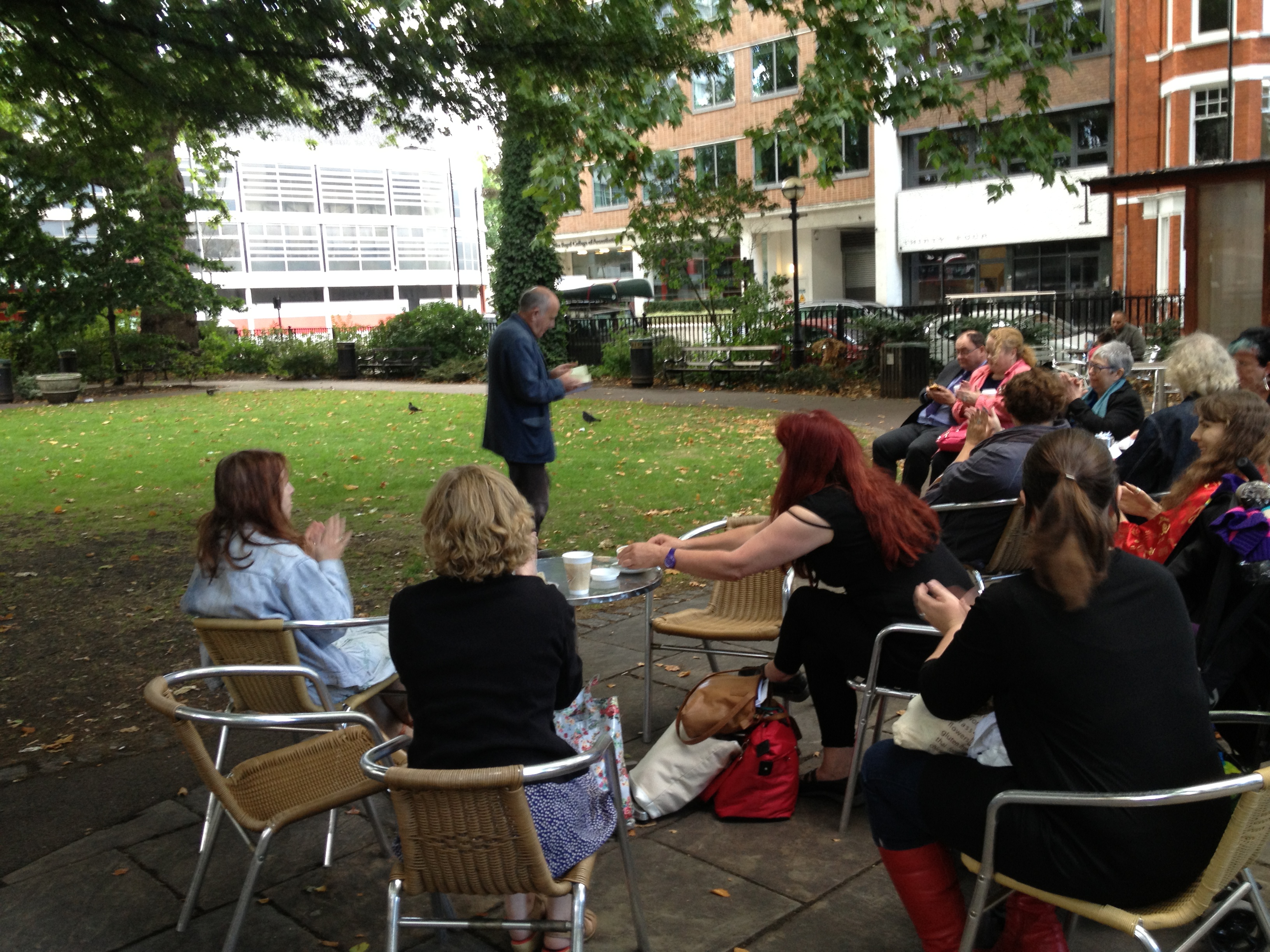 There are pictures on the Poetry Book Fair site of the rows of poetry book stalls and of some of the readers., proving that poetry publishing is lively, healthy and diverse. The photo above is one that Charles Boyle might not have known about; there was a Book Fair Fringe going on, in the cafe in Red Lion Square, just outside the venue. This is Nicholas Murray, reading from his collection from Melos; “Of Earth, Water, Air and Fire – animal poems”.