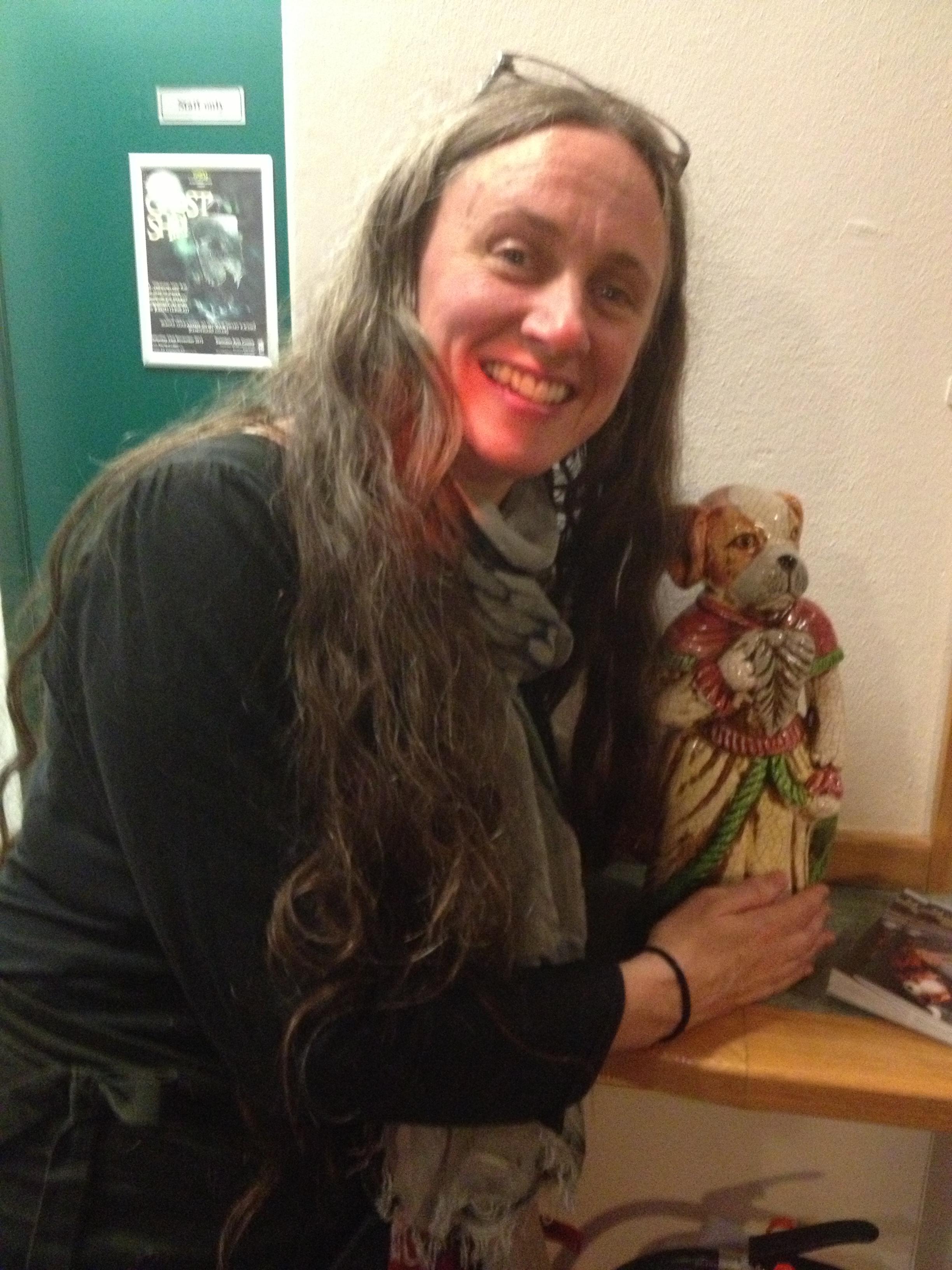 One of my Tideway colleagues was there; Ruth Wiggins was commended in the competition and read her mysterious poem (beautifully) which is entitled: “Confession: I’ve been crumbling antihistamines into your food all week”. Here’s Ruth, posing in Swindon Arts Centre with the festival mascot, who I am told is called Ophelia Dog.